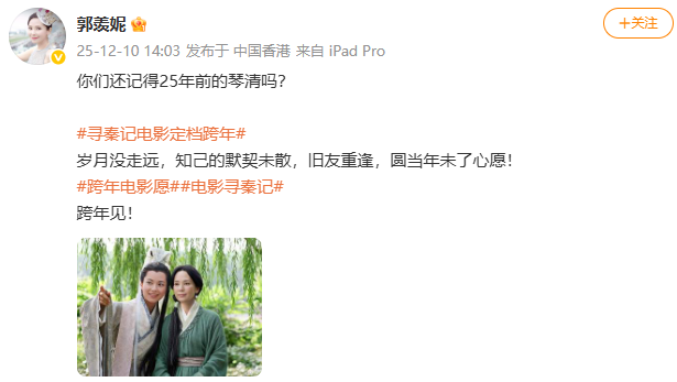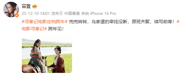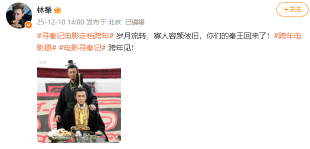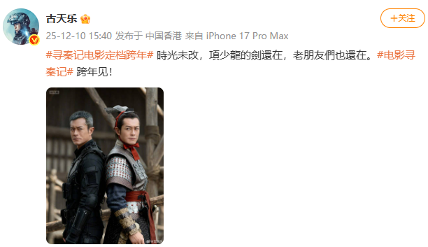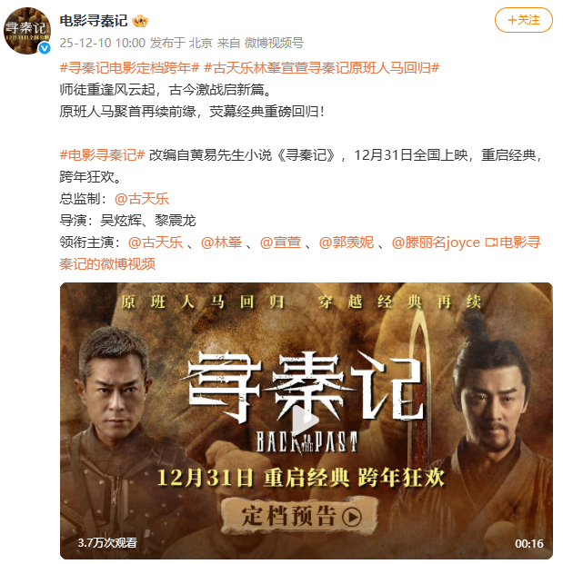 12月10日,电影《寻秦记》官宣定档,将于2025年12月31日登陆全国院线。