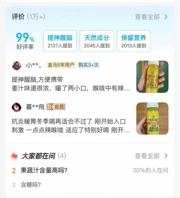 盒马APP页面显示,姜黄饮评价1万+,好评率高达99%,上千人提到“提神醒脑”“天然成分”“保留营养”等关键词。