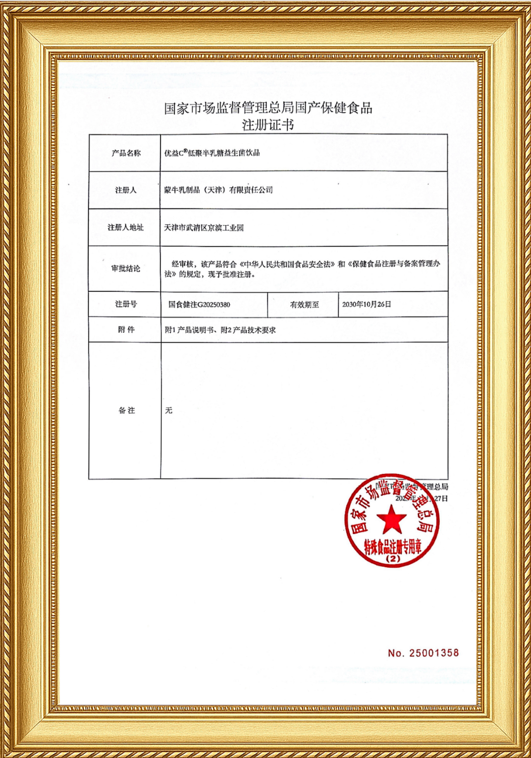 近日,在持续深耕国民健康事业的道路上,蒙牛集团旗下明星品牌优益C迎来历史性里程碑。历经十二载潜心研发与严苛验证,优益C低聚半乳糖益生菌饮品正式获得国家市场监督管理总局颁发的《国产保健食品注册证书》(俗称“健字号”)。