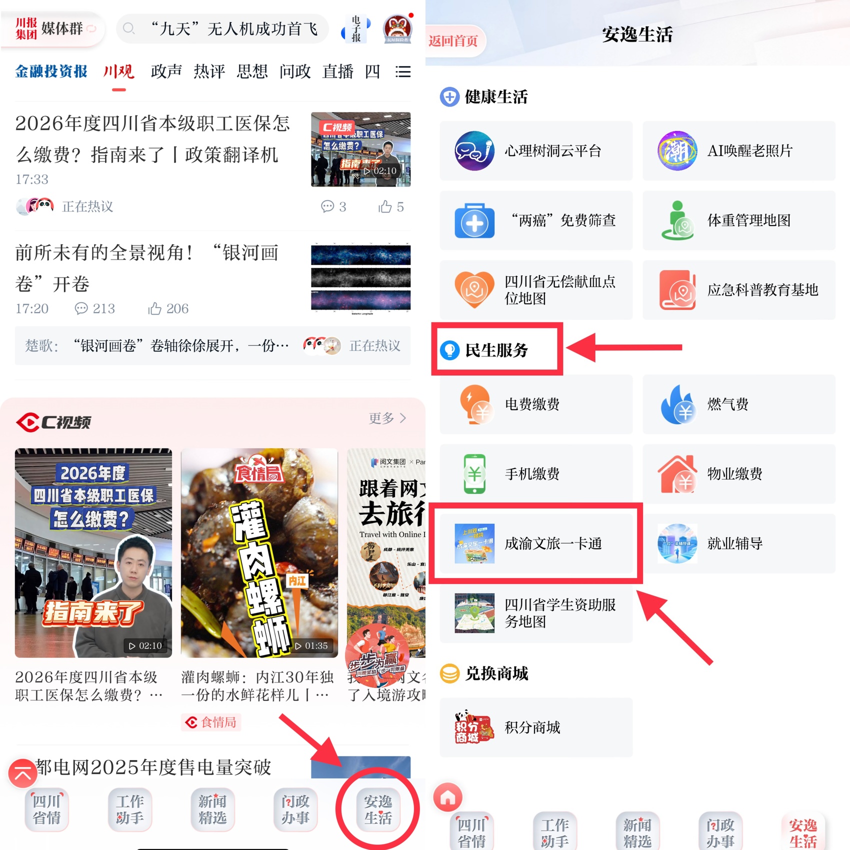 在川观新闻首页,点击右下角“安逸生活”,下滑找到“民生服务”,点击“成渝文旅一卡通”图标,进入点击“点击购卡”按钮,即可跳转购买页面,选择“成渝年卡”去购买。
