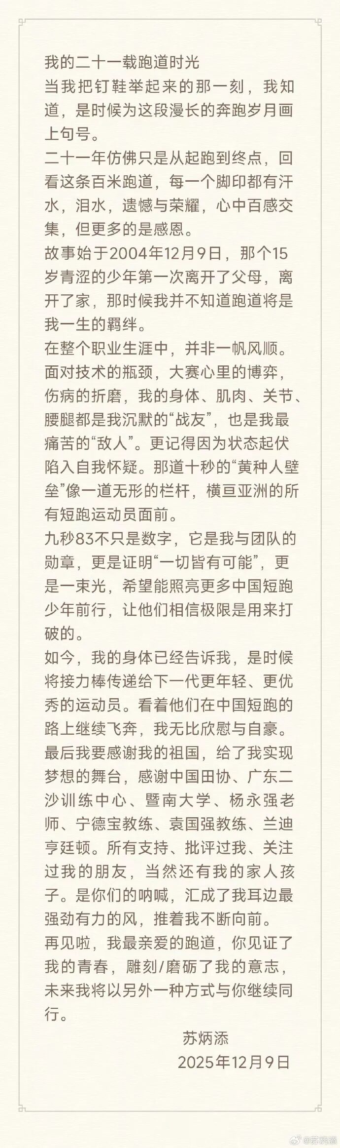 12月9日10时许,@苏炳添 在微博发文,回顾“二十一载跑道时光”。