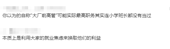 与此同时,有人虚构大厂前员工、高管身份,通过“蹭大厂流量”提供名不副实的服务,以求实现商业牟利。据央视网报道,在互联网平台上,有人利用大厂身份担任培训机构讲师,承诺“内推”“包入职”,实为把学员简历投进公开招聘平台;有人自称“前大厂技术总监”,收取高额培训费,实则连试用期都没过;有人连离职信息都是买的:“代办大厂离职证明”已经成为灰色产业链,可以轻松虚构身份、编造离职帖。