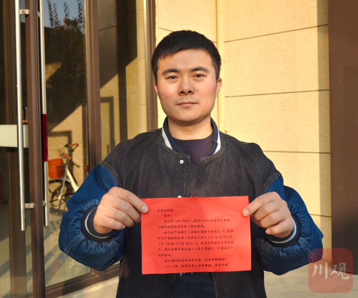 两年前,来自黑龙江省齐齐哈尔市的小伙张志超,怀揣着对未来的憧憬和对家乡的眷恋,离开妻儿独自到武汉打拼。今年10月一个星期六的晚上,张志超下班回家时发现,门把手上挂着一袋小零食,上面还放着一张红纸。红纸上面写着“我们是1401的住户,近期计划对房屋进行装修,可能会给您和您的家人带来影响。”“在此期间给您带来的不便,还望谅解海涵!”等令人温暖的语句。