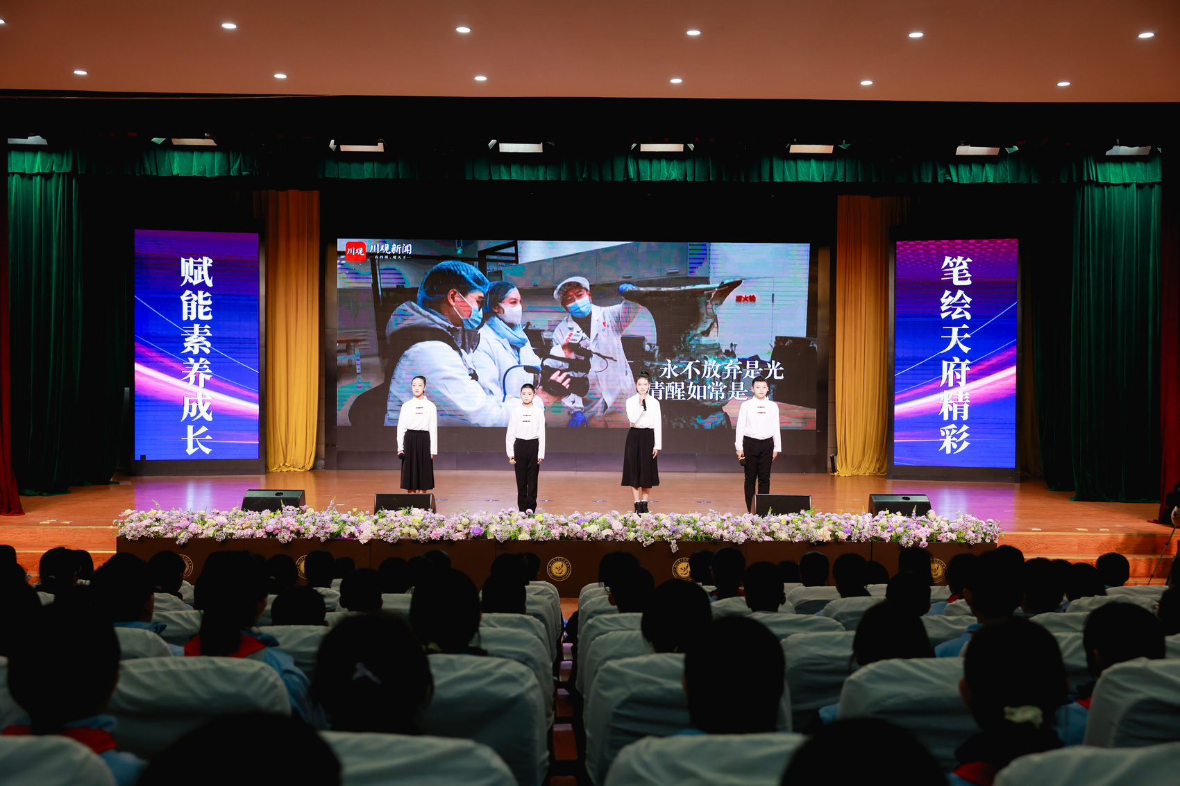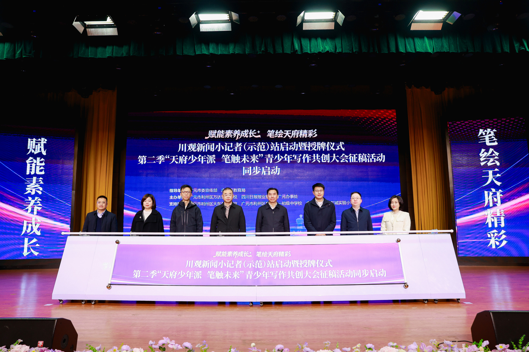上午9时,仪式在庄重而热烈的氛围中开始。仪式现场,校长杨宇恒寄语同学们“观察世界、书写时代”,鼓励大家以小记者的身份发现生活之美。广元市教育局、市委宣传部相关领导也先后致辞,肯定了此次校媒共建对提升青少年综合素养的重要意义。随后,多位嘉宾共同拉动启动画轴,标志着“川观新闻小记者(示范)站”正式启动。第二季“天府少年派·笔触未来”青少年写作共创大会,以“蜀道新歌”为主题的征文活动也同步开启。