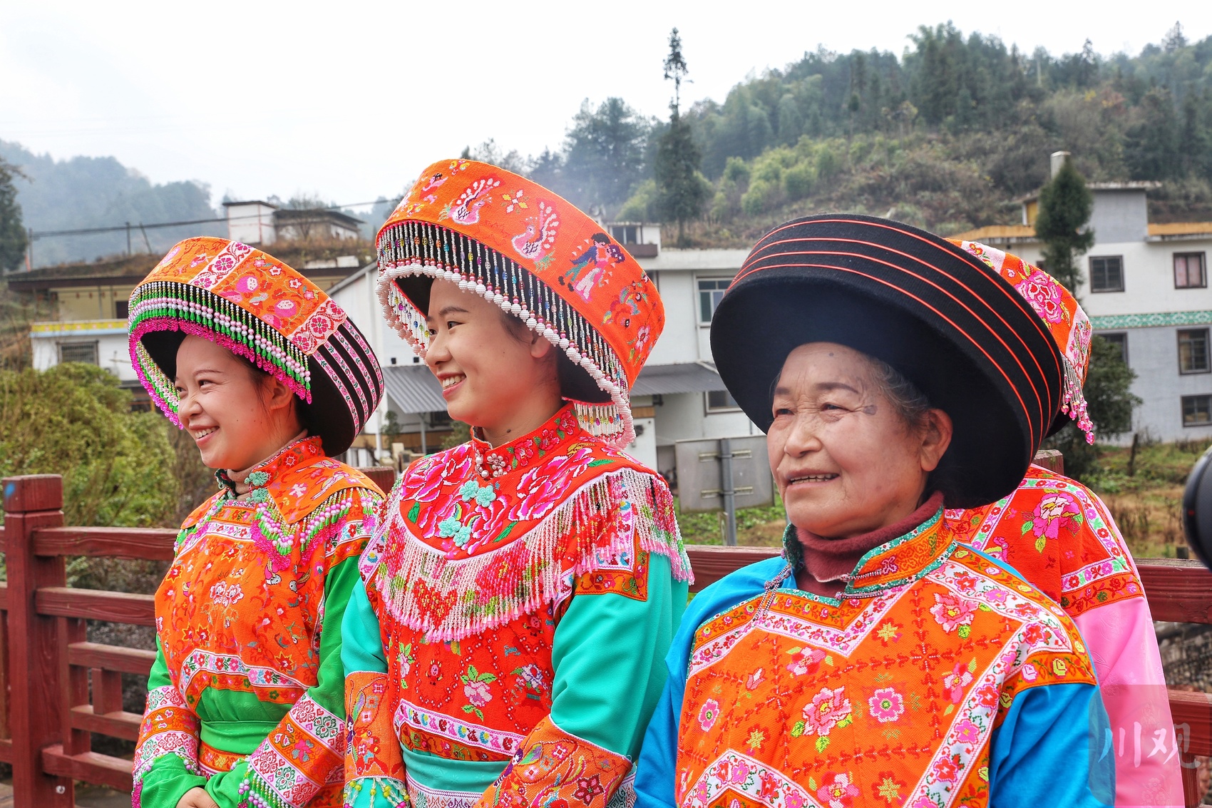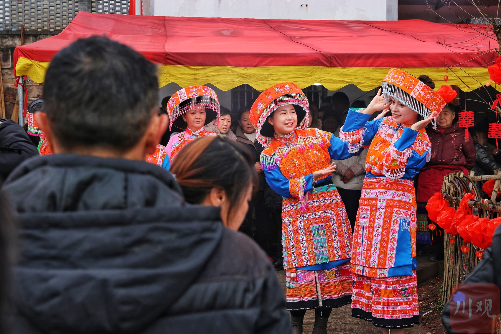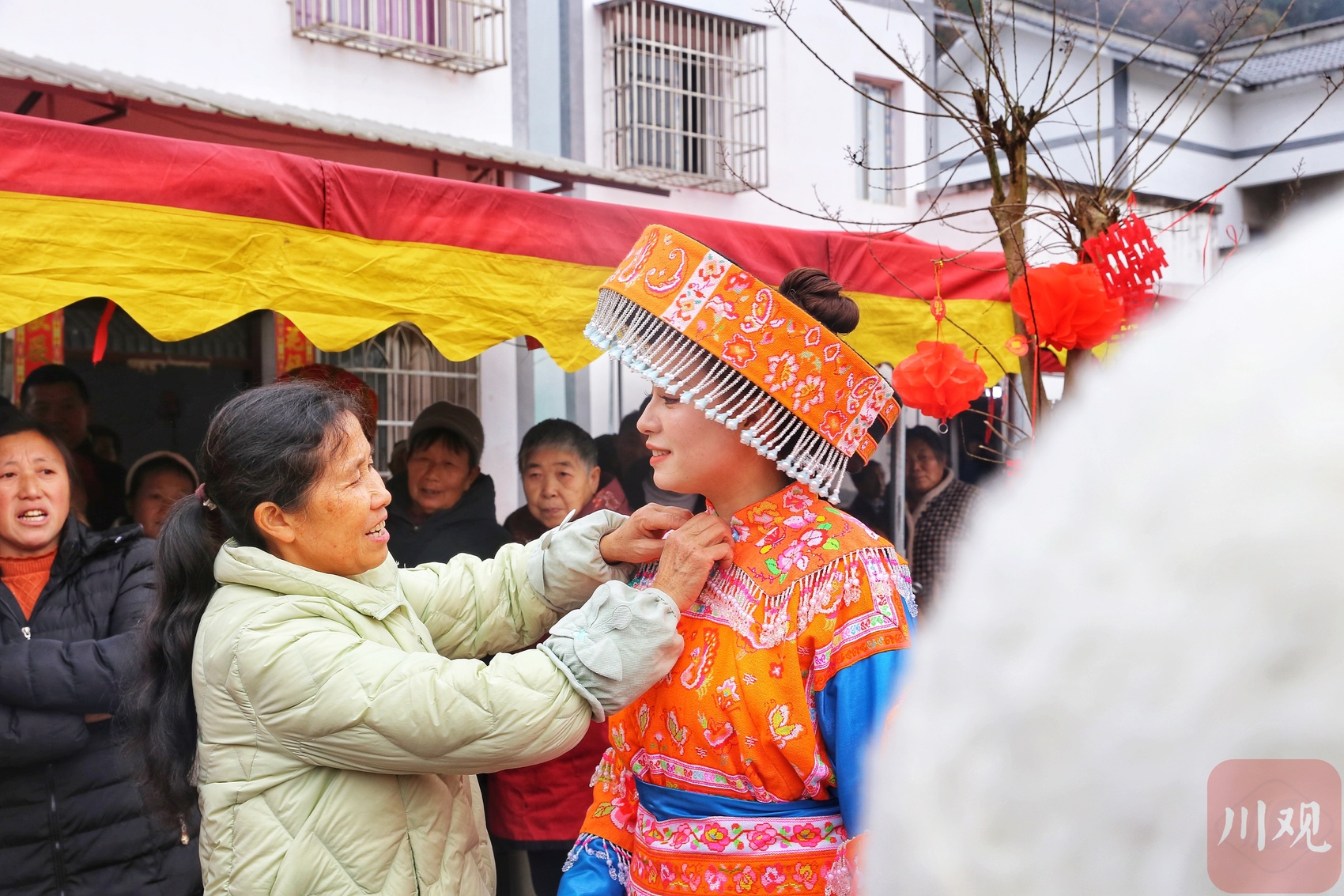 12月10日,泸州市古蔺县大寨苗族乡富民村,一户苗族人家张灯结彩,为即将出嫁的女儿陶倩筹备家宴。屋内亲朋齐聚,欢声笑语中,新娘陶倩换上母亲王秀英亲手缝制的苗绣嫁衣——一件以蝴蝶纹、孔雀、牡丹花等传统图案交相辉映的华服。
