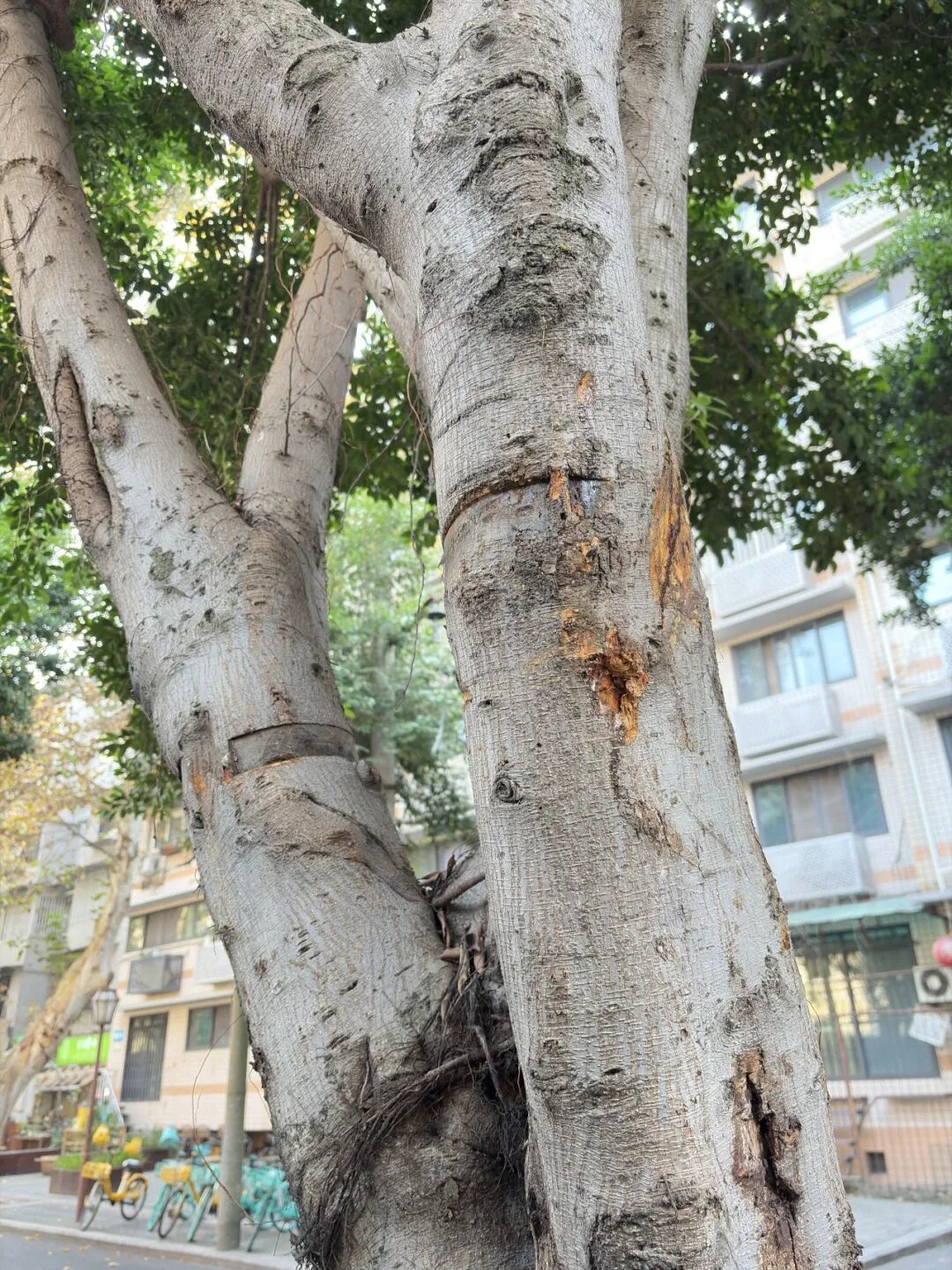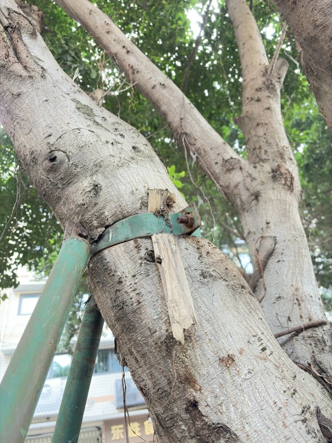 12月1日中午,刚到宽窄巷子附近东胜街上班一个月的洋洋,像往日一样,吃完午饭想出门透口气散散步,走到路上,无意间注意到好几棵树都安装了支撑脚架和金属箍固定,心想:可能为了防止风把树吹倒吧,不过看着树真的好疼呀,好想帮它解开。