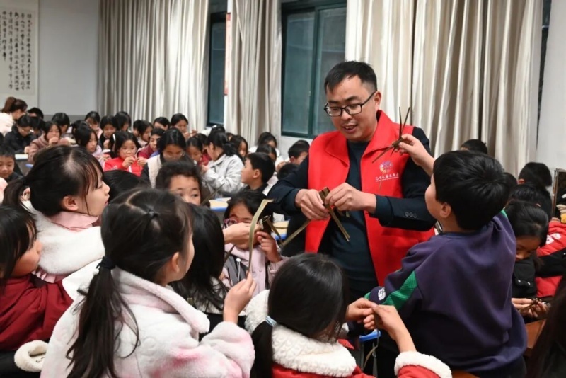 校园里,绳编传承人李清明手把手教大家打结、编织,一根根彩绳在指尖缠绕成精美的挂饰;棕编课堂上,棕编传承人杨林带领学生利用天然棕叶,折出形态各异的小动物,让孩子们在创作中体会传统手工艺与自然材料的巧妙结合。