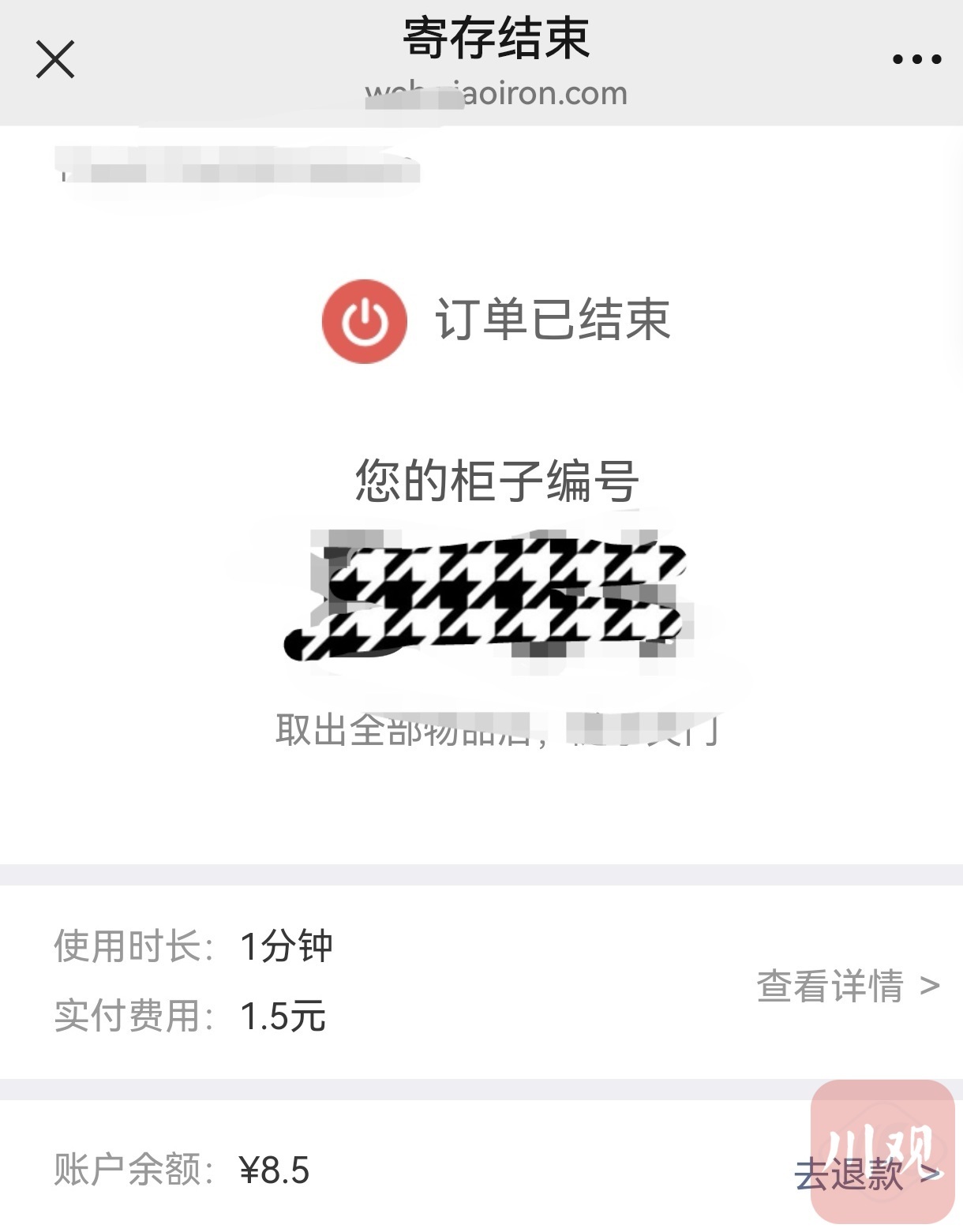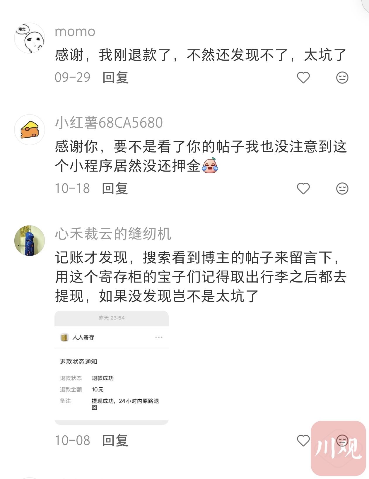 不仅如此,在春熙路百盛购物中心、成都南站附近的苏宁广场、成都东站等地,记者相继使用了“悦存空间”“小铁”等多个品牌的寄存柜服务后发现,不少商家在押金退回方式上均有类似情况,即使用后押金并非原路返回,而是退回小程序内的“个人中心”或其他类似账户,用户需手动操作才能提现。