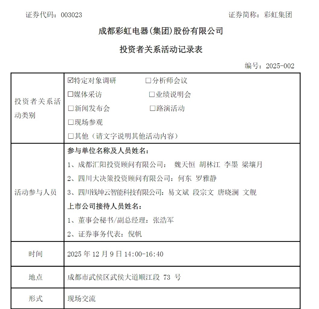 根据12月11日公司披露的投资者关系活动记录表来看,12月9日,成都汇阳投资顾问有限公司、四川大决策投资顾问有限公司、四川钱坤云智能科技有限公司和公司董秘、证代等管理人员进行了现场交流。