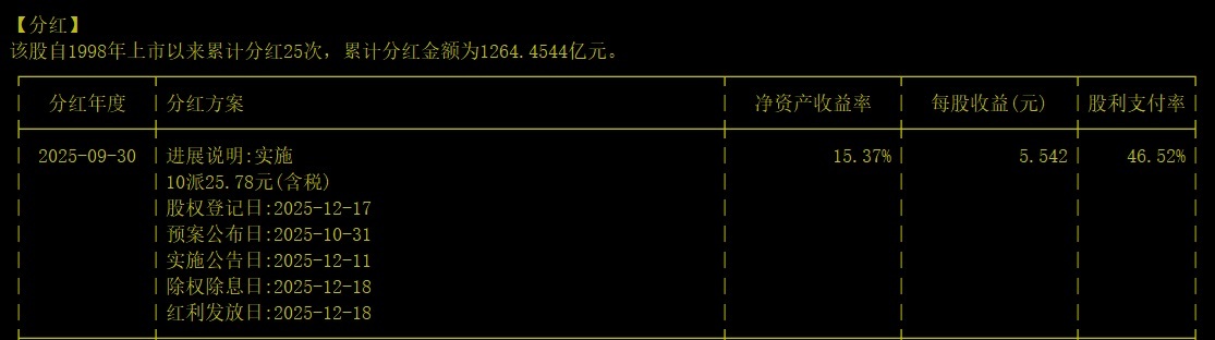 公告显示,贵州茅台本次利润分配以方案实施前的公司总股本12.52亿股为基数,每股派发现金红利23.957元 (含税),共计派发现金红利约300.01亿元(含税)。股权登记日为2025年12月18日,除权(息)日和现金红利发放日均为2025年12月19日。