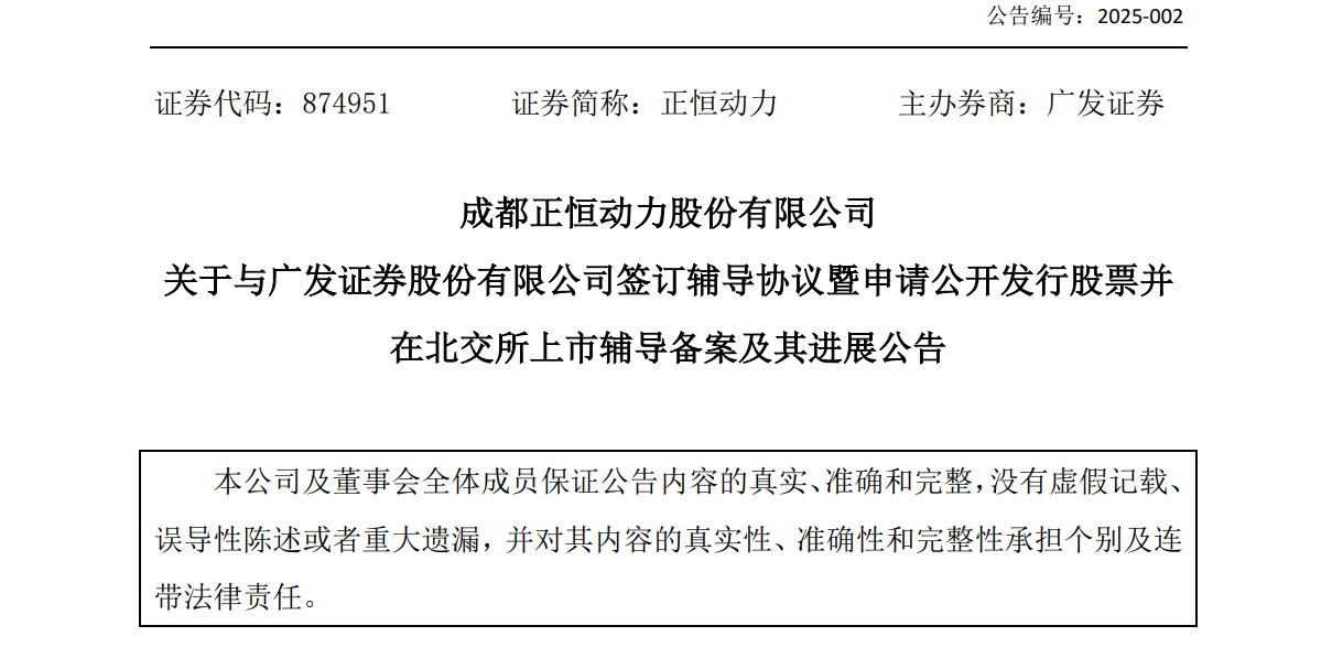 此次董事会换届,恰逢正恒动力资本市场运作的关键转折点。近日,公司已获四川证监局上市辅导备案登记,正式启动北京证券交易所IPO进程,辅导机构为广发证券。而距离其在深交所创业板撤回上市申请,仅仅过去了不到十个月。