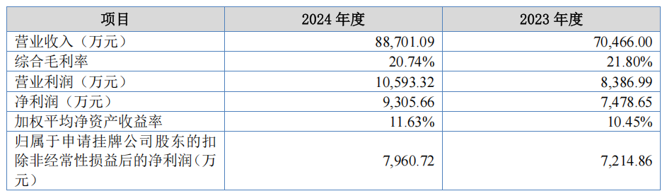 财务数据显示,公司营收规模持续扩大。2020-2022年度,公司营业收入分别为5.74亿元、6.40亿元和7.32亿元,归母净利润分别为5514.22万元、6184.97万元和7630.40万元。2023年业绩略有回调,营业收入为7.05亿元,归母净利润为7478.65万元。2024年呈现显著回升,全年营业收入达8.87亿元,归母净利润增至9305.66万元。