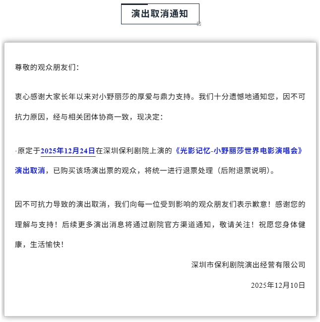 据通知,因不可抗力原因,经与相关团体协商一致,现决定:原定于2025年12月24日在深圳保利剧院上演的“光影记忆-小野丽莎世界电影演唱会”演出取消,已购买该场演出票的观众,将统一进行退票处理。