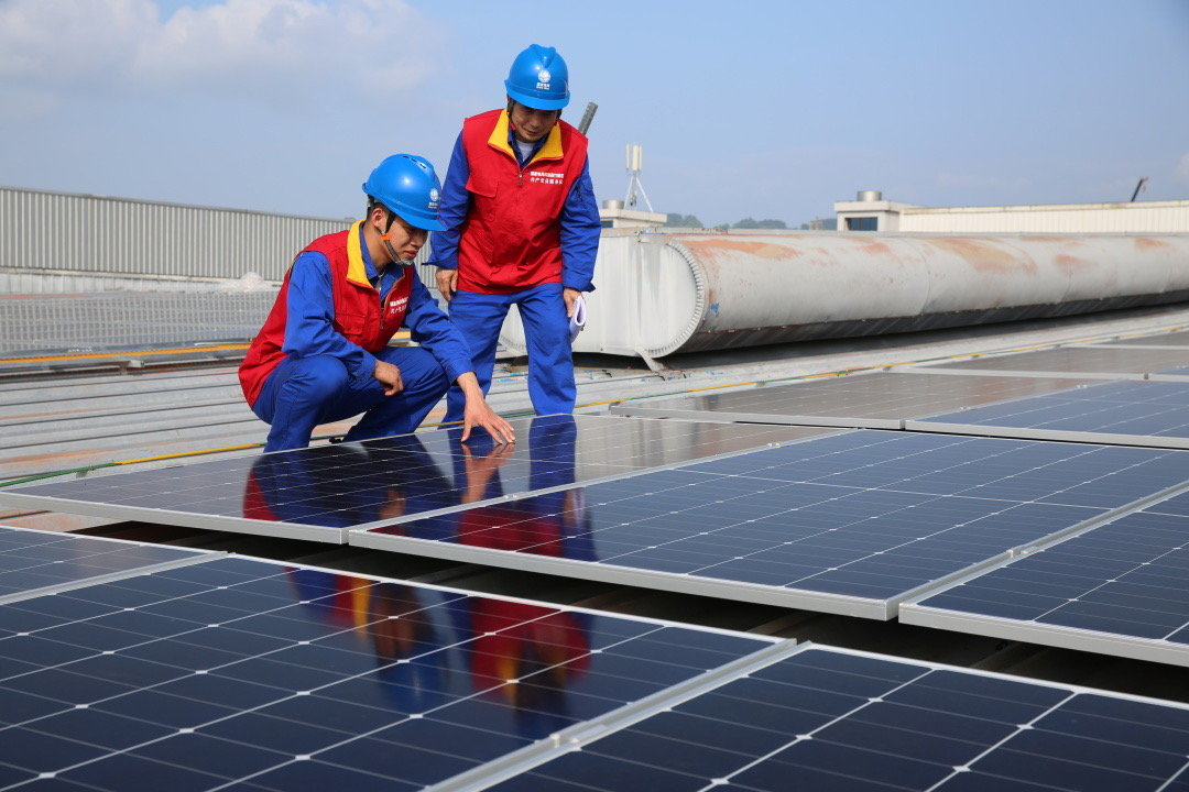 电力人员协助企业客户开展光伏发电设备日常巡检
