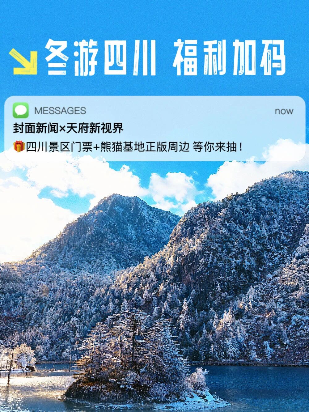 四川人看雪晒太阳的季节又到了!❄️一半冰雪,一半暖阳——冬天的四川处处都是宝藏地。在这里,你可以沉浸蜀山冰雪、拥抱川西暖阳、享受温泉火锅、体验民族风情……多样旅行心愿,冬游四川“一站式”全满足![哇]想亲身感受?封面新闻 × 天府新视界 送你冬日福利:⛰️四川热门景区门票(峨眉山/乐山大佛/螺髻山)成都大熊猫基地正版周边(玩偶挂件/冰箱贴)✅如何参与抽奖?(关注2个号)①关注@封面新闻公众号➤回复“冬游四川”立即抽奖②关注@天府新视界公众号➤回复“冬游四川”再抽1次⏰活动时间:12月11日至12日每人每天都有2️⃣次抽奖机会赠票有效期:峨眉山/乐山大佛:即日起至2026年9月螺髻山:即日起至2026年3月温馨提示:中奖用户需在12月12日24点前填写收货信息,逾期未填写或信息不完整均视为自动放弃领奖。奖品将在活动结束后10个工作日内陆续寄出。⭐️记得关注@天府新视界公众号,中奖机会x2❗快快动手,一起感受冬日四川的锦绣与安逸吧 ❄️✨