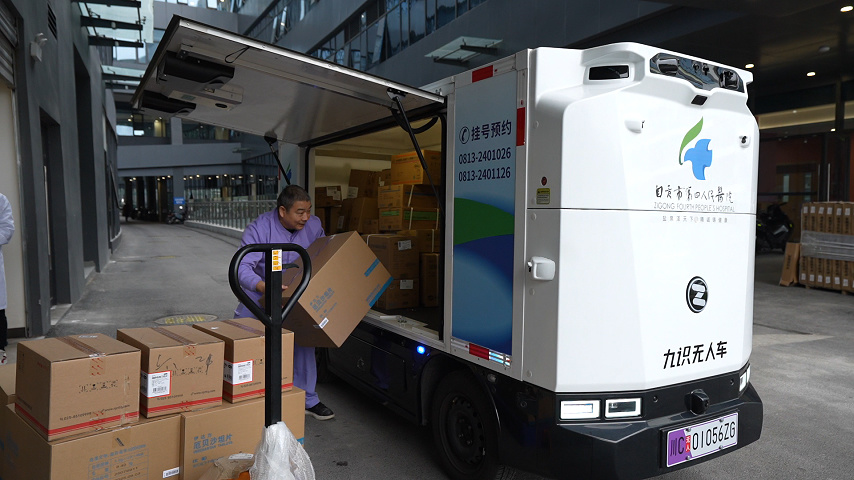 无人车正在自贡道路上行驶。