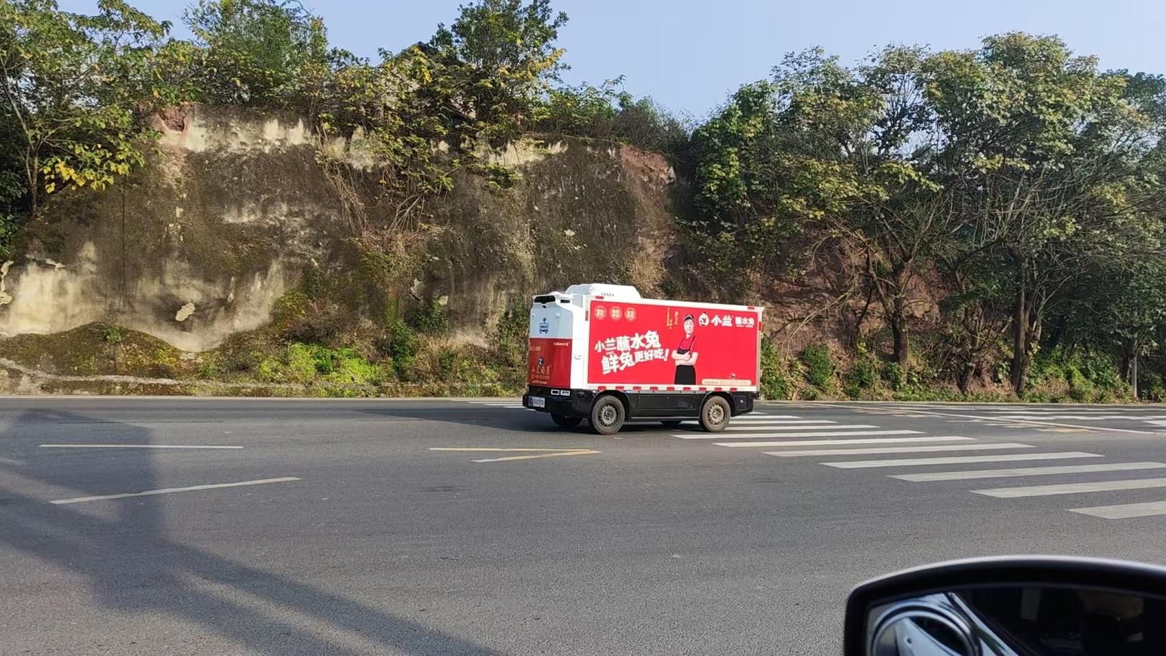 小兰卤菜无人车正在路上行驶。