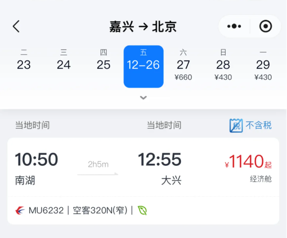 票价方面,记者昨晚(12月10日)查询时,12月26日嘉兴飞北京经济舱票价为772元起(不含税)。但是今天早上查询,价格已涨至1140元(不含税),目前已宣告售罄。