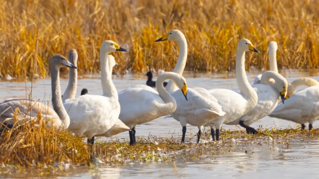 从阿力提供的影像资料中可以清晰看出,这几只天鹅喙部的黄色区域显著,黄色从喙基向前延伸,明显超过了鼻孔范围,这正是典型的大天鹅特征。此外,这四只大天鹅当中还有一只是亚成体。“所以基本可以判断他们应该是野生的大天鹅。”赵凯说道。它们姿态雍容,在浅水区悠然觅食,梳理羽毛,和小天鹅混群,显得体积格外大。此外,大天鹅的鸣叫声也更为洪亮。