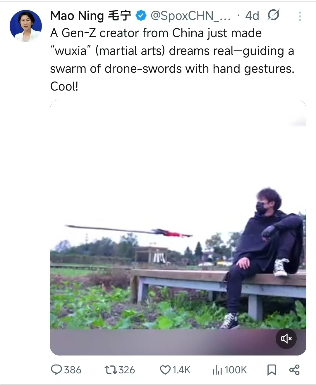 最近一次,就在上周(12月7日),外交部发言人毛宁在海外社交平台点赞了成都博主“范十三”的视频。视频里,他把“万剑归宗”的中国式浪漫搬进了现实,搞了一场超酷的“飞剑”集群飞行实验。