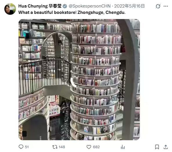 再把时钟拨回3年前, 2022年,当时的发言人就在海外平台点赞了都江堰的钟书阁。这个网红书店,设计感直接拉满,拿奖拿到手软。