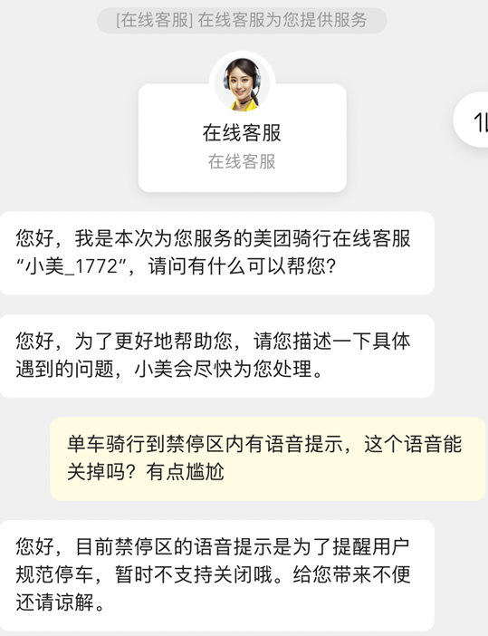 针对上述情况,记者咨询了美团官方客服,得到的回应是“暂时不支持关闭喇叭”。记者认为,该提示语音确实可以有效提醒用户不要将共享单车停放在禁停区内,但如果用户是临时停放,比如路过禁停区去买个菜,办个事等,这时共享单车发出的声响,有可能会让一些市民感到尴尬和不适。