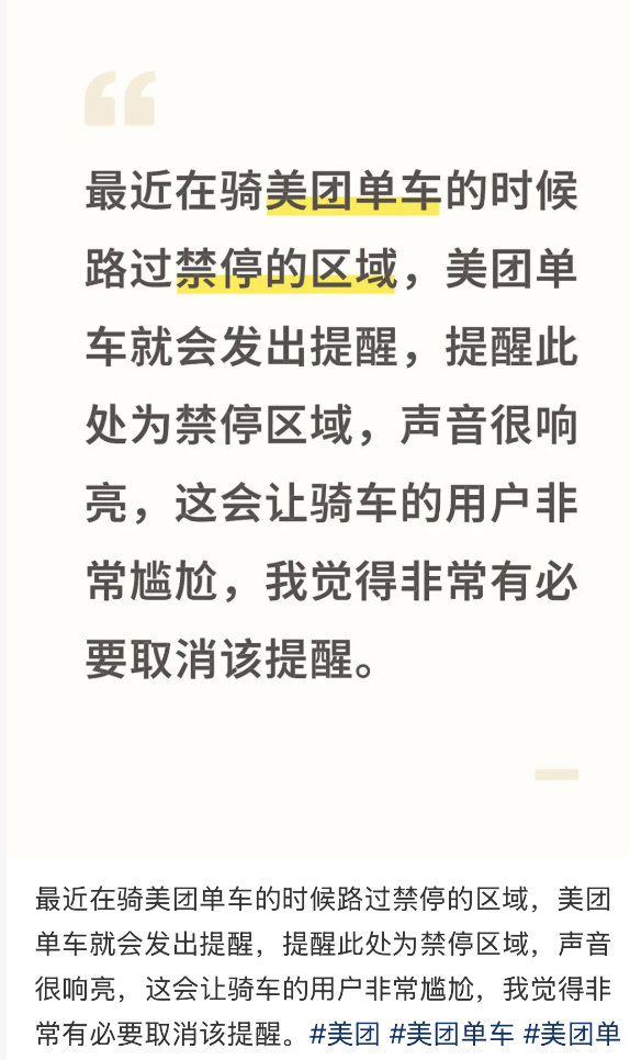 近日,有网友在社交平台报料称,骑行美团共享单车路过禁停区域时,单车会发出很响的提示语音,让骑行者觉得非常尴尬。