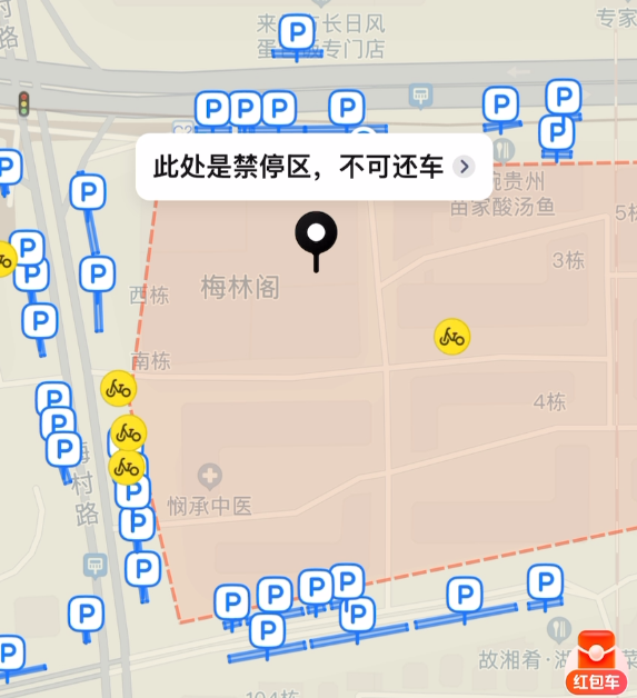 记者在美团APP的“共享单车地图”上看到,地图上有很多红色的区域,是美团设置的“共享单车禁停区”,禁停区一般都是公共区域,如小区、公园等。如果用户在禁停区内还车,可能将面临无法还车甚至罚款的情况。