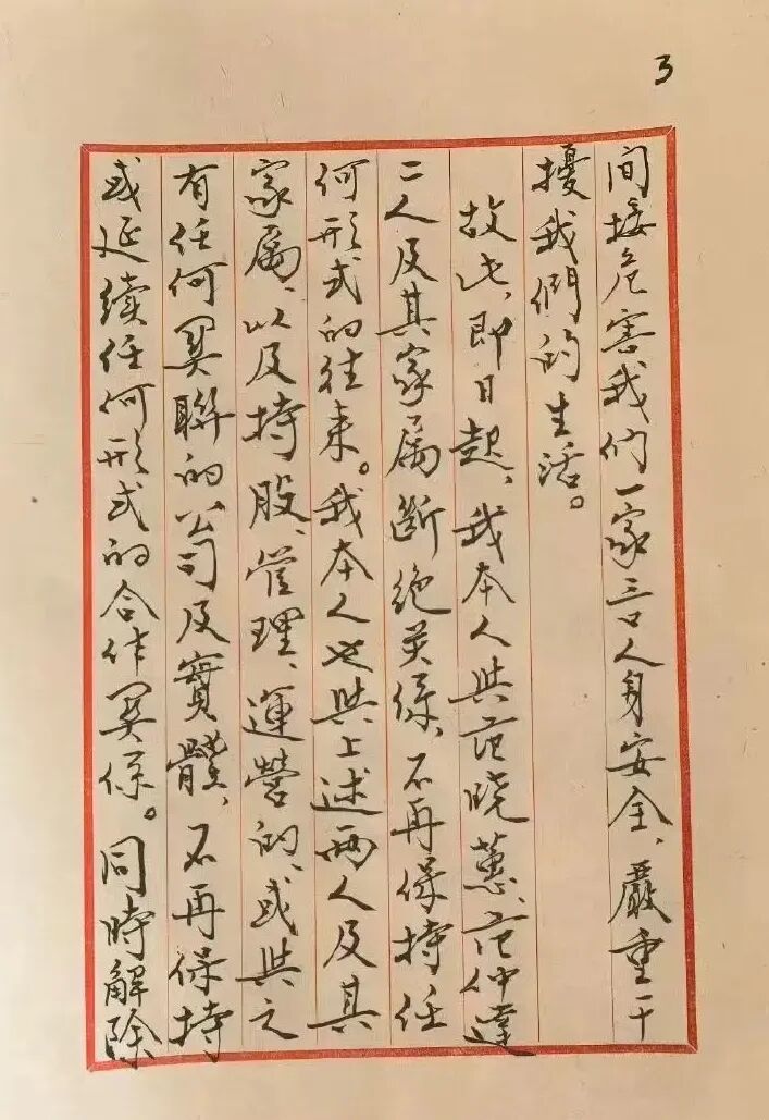 故此,即日起,我本人与范晓蕙、范仲达二人及其家属断绝关系,不再保持任何形式的往来。我本人也与上述两人及其家属、以及持股、管理、运营的,或与之有任何关联的公司及实体,不再保持或延续任何形式的合作关系。同时解除并撤销对上述两人及其家属、其所涉及实体的任何委托、授权或其他合同关系。上述人员及实体不得再以我的名义对外从事任何活动。上述人员及其实体的任何活动也均与我本人无关。对其在销售、展览、赠与或其他任何活动中涉及到我本人名义的艺术作品,我个人均不予置评,但保留追究其法律责任的权利。