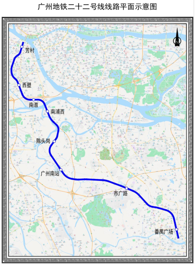 二十二号线全长29.7公里,设车站8座,其中换乘站4座,定位为时速160公里的南站快线。其中,二十二号线首通段(番禺广场-陈头岗)已于2022年3月31日开通运营,后通段(陈头岗-芳村)将于月底开通运营。