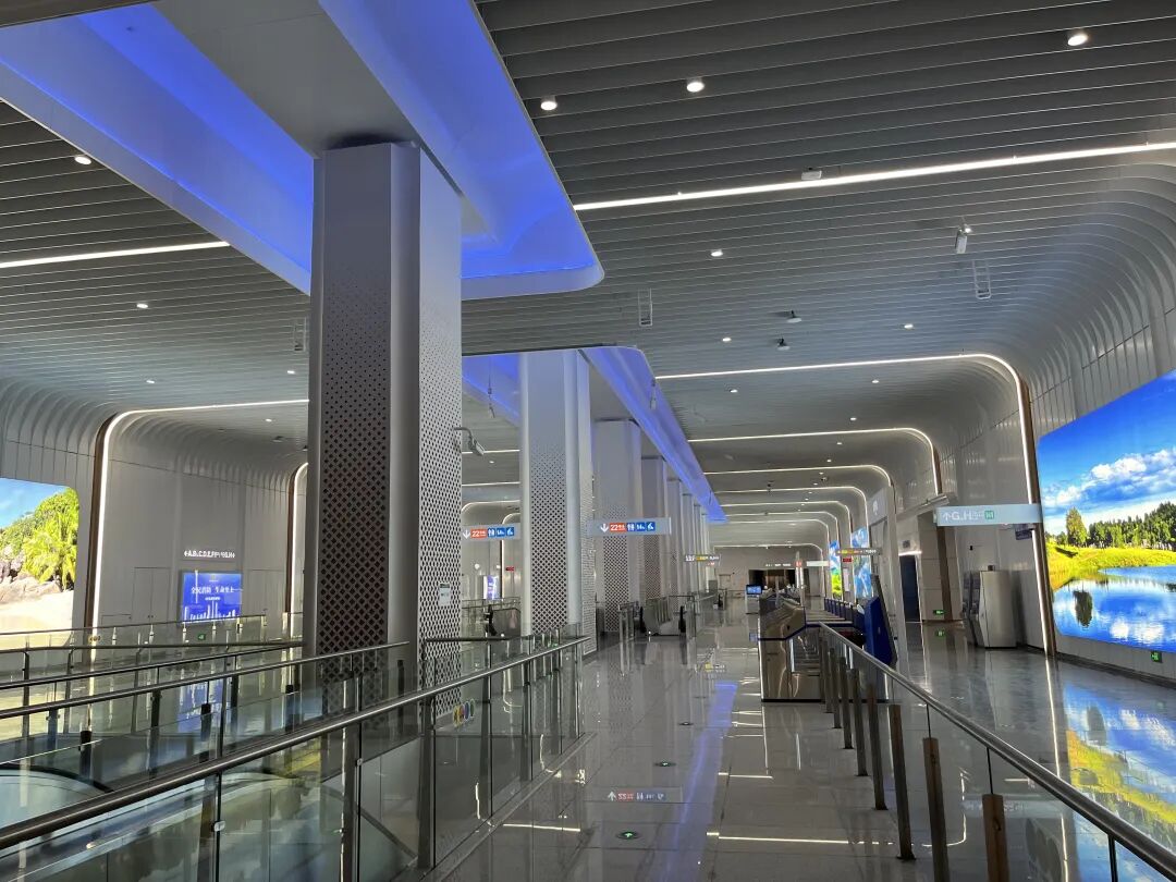 西塱站装修设计通过不同线路对应的线路色,打造色彩差异化扶梯交通点,形成强烈的视觉引导系统,便于在复杂的枢纽空间中有效引导客流,提高换乘效率。