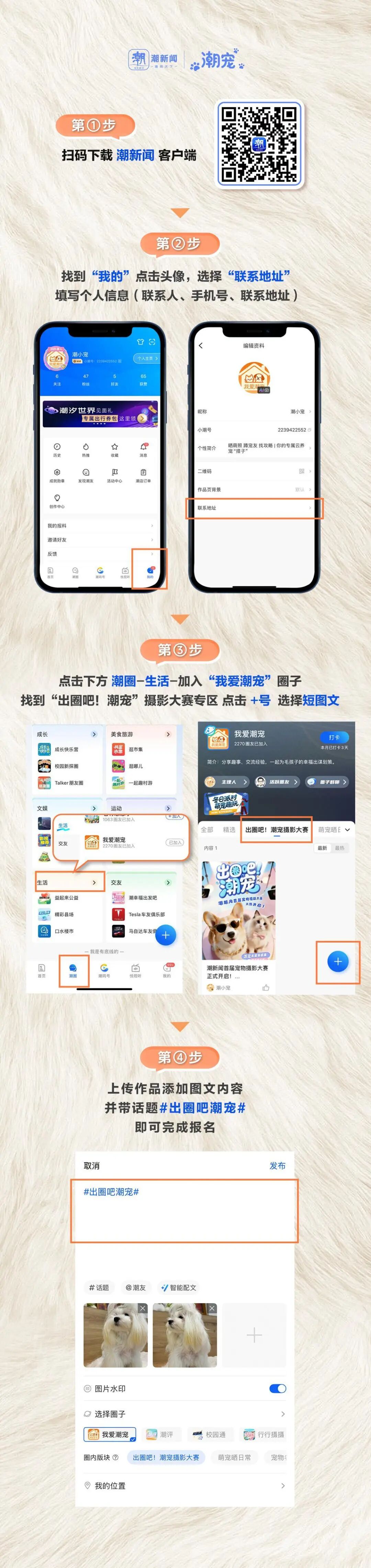 ③找到“潮圈”顶部的“广场”,点击左下角“生活”,加入“我爱潮宠”圈子,找到“出圈吧!潮宠”潮新闻首届宠物摄影大赛专区;