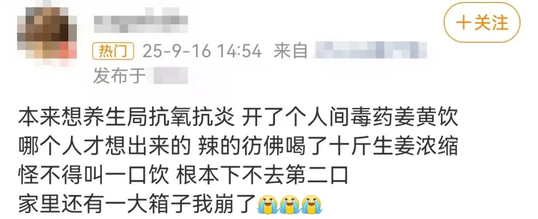 截至12月9日,话题“姜黄饮”在一社交平台上的阅读量已经超过1247万次。与此同时,这类饮料的味道频遭吐槽。有网友评论称:“世界上怎么会有姜黄饮这么难喝的东西”“根本下不去第二口”。也有人评论称:“我骗自己是橙汁。”