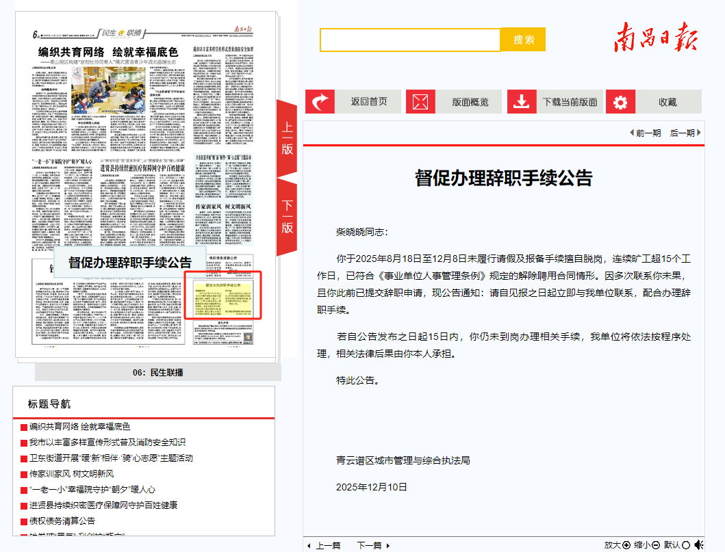 昨天(12月10日),江西南昌市青云谱区城市管理与综合执法局在《南昌日报》刊发“督促办理辞职手续公告”,全文如下: