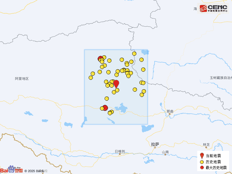 历史地震:根据中国地震台网速报目录,震中周边200公里内近5年来发生3级以上地震共65次,最大地震分别是2021年11月30日在西藏那曲市双湖县发生的5.8级地震(距离本次震中148公里)和2021年3月30日在西藏那曲市双湖县发生的5.8级地震(距离本次震中183公里),按震级大小前50次历史地震分布如图。
