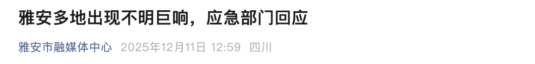 此外,根据地震监测台网数据,巨响发生时雅安及周边区域未记录到天然地震活动。应急部门提醒市民不必恐慌,后续将密切关注相关情况。