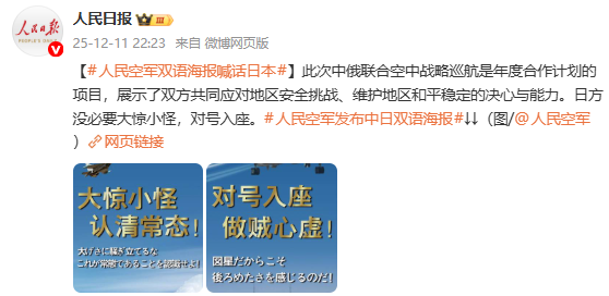 12月11日,外交部发言人郭嘉昆在例行记者会上回答有关中俄联合巡航的提问时表示,此次中俄联合空中战略巡航是年度合作计划的项目,展示了双方共同应对地区安全挑战、维护地区和平稳定的决心与能力。日方没必要大惊小怪,对号入座。
