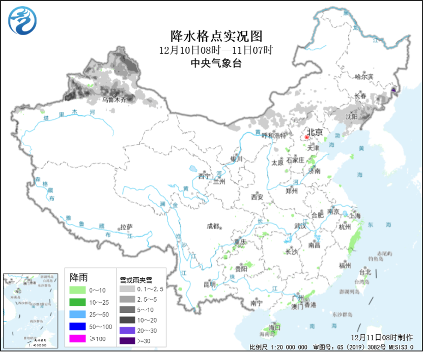 12日,降雪区域继续东移,内蒙古中部、东北地区南部、华北、黄淮等地部分地区有小到中雪或雨夹雪,其中,内蒙古中部、山西中北部、河南中部等地部分地区有大雪(5~9毫米)。