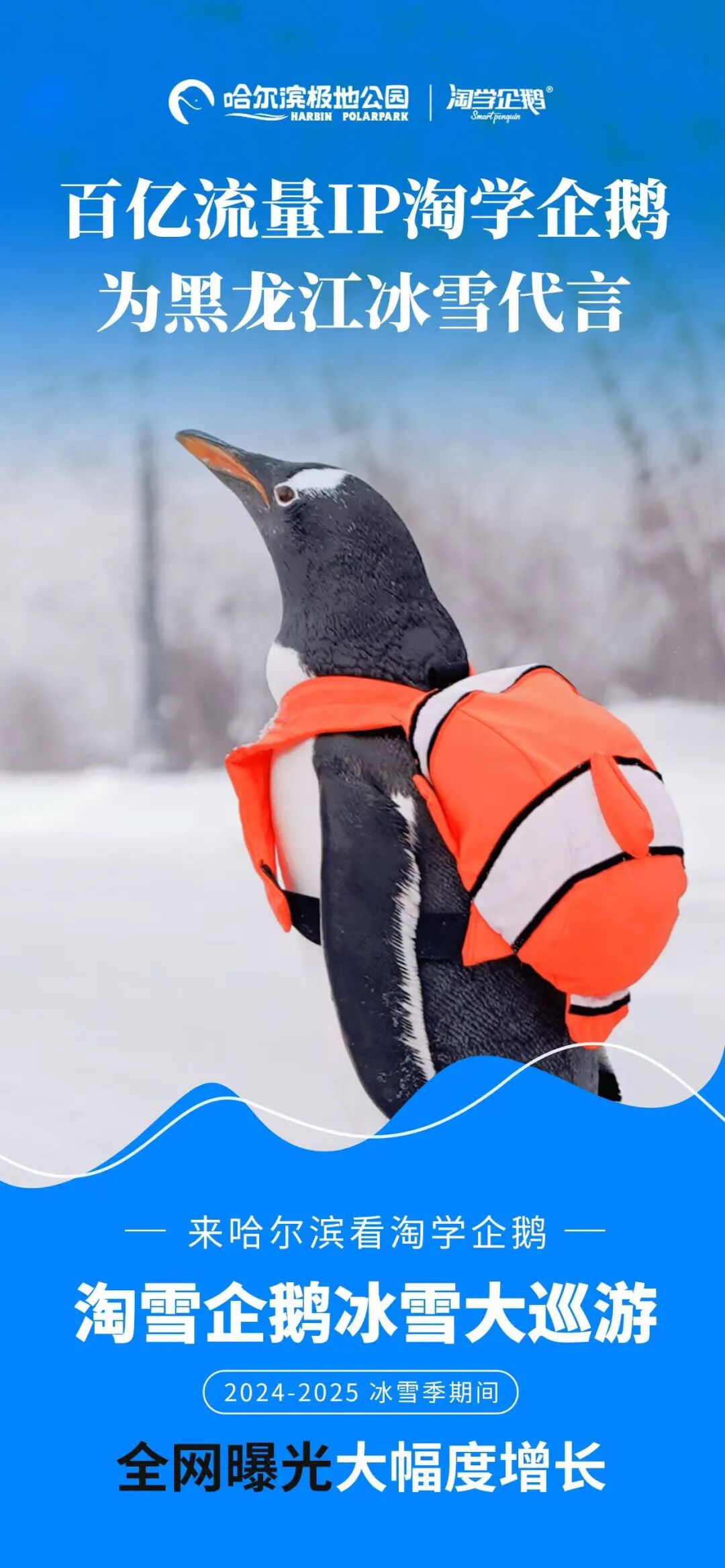 哈尔滨极地公园原创冰雪文旅IP“淘学企鹅”,开创性地将南极企鹅引入户外场景,原创“淘学企鹅打卡地标景点”、“淘学企鹅城市巡游”和“淘学企鹅冰雪大巡游”三大爆款活动。作为黑龙江冰雪天使、哈尔滨城市旅游IP,“淘学企鹅”全网曝光量突破300亿次,成为全国最具影响力的城市品牌之一,“来极地公园,看企鹅巡游”成为全国游客的热门打卡目标。
