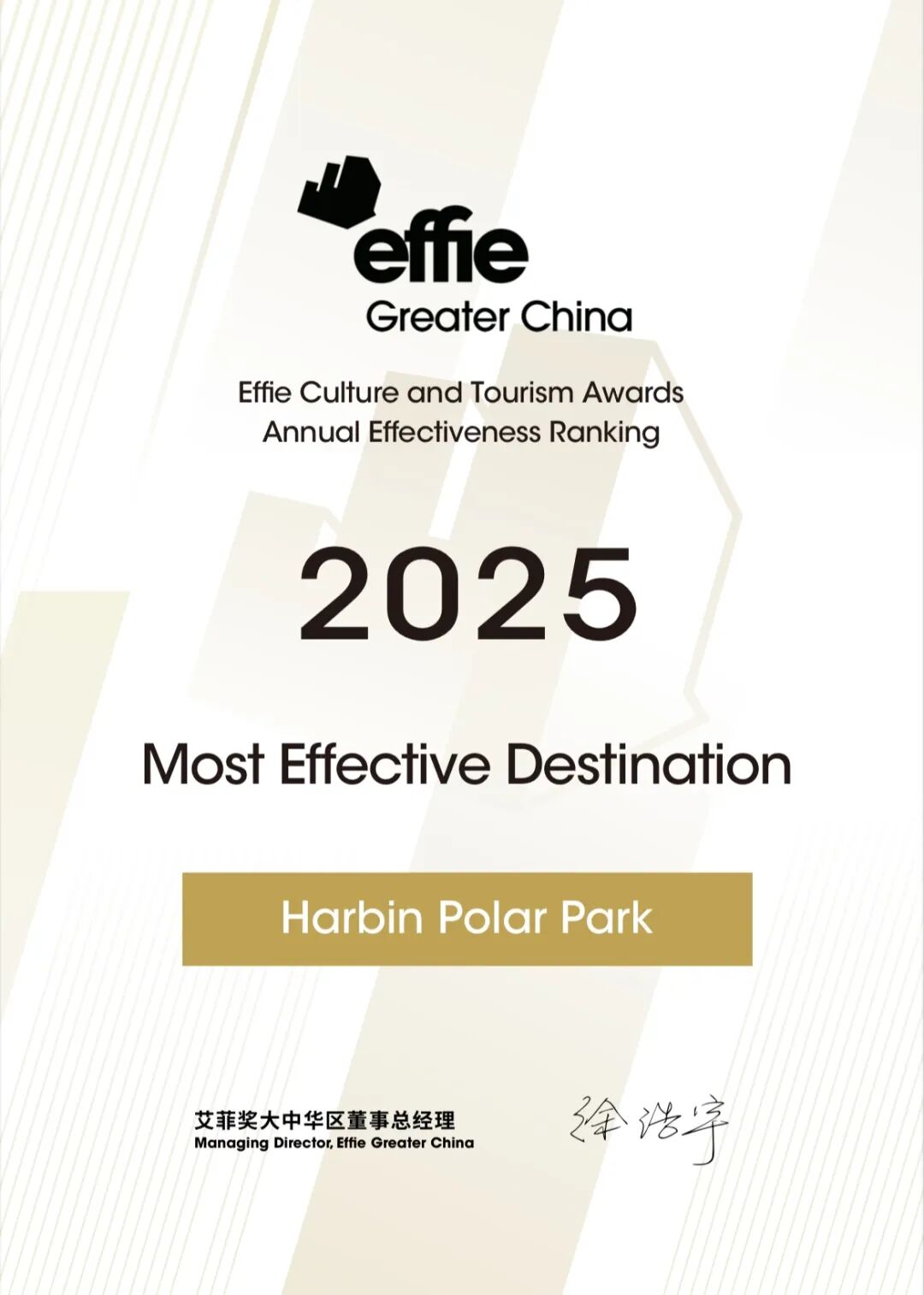 哈尔滨极地公园数年来持续深耕文旅行业,此次荣获艾菲文旅奖,不仅是哈尔滨极地公园在文旅IP创新与品牌营销实效方面获得国际认可的重要标志,更为全国文旅行业在文旅IP营销方面开拓了具有创新特色的“极地方案”。
