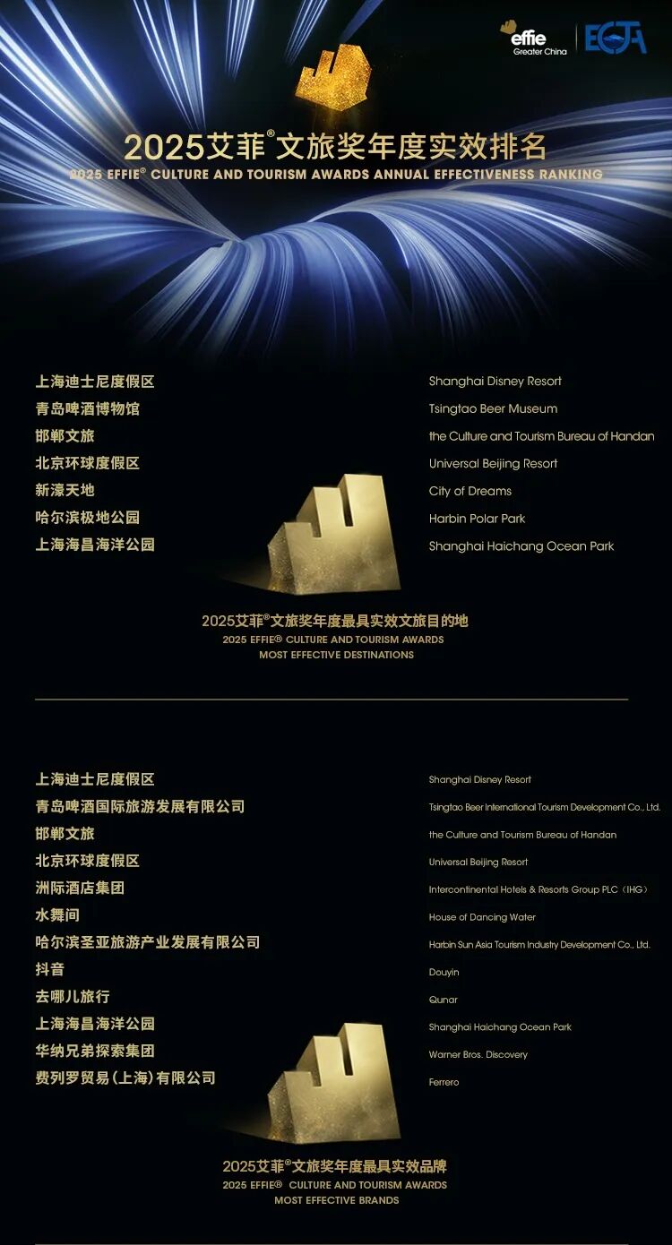 12月10日,在2025大中华区艾菲盛典上,哈尔滨极地公园凭借其在文旅行业的卓越表现与创新成就,从众多全球顶尖品牌竞争中脱颖而出,与上海迪士尼、北京环球影城共同荣获2025艾菲文旅奖“年度最具实效文旅目的地”“年度最具实效品牌”两项殊荣,“百亿流量IP淘学企鹅为黑龙江冰雪代言”案例成功斩获艾菲文旅奖—IP营销类铜奖,成为东北地区唯一获此殊荣的文旅景区。