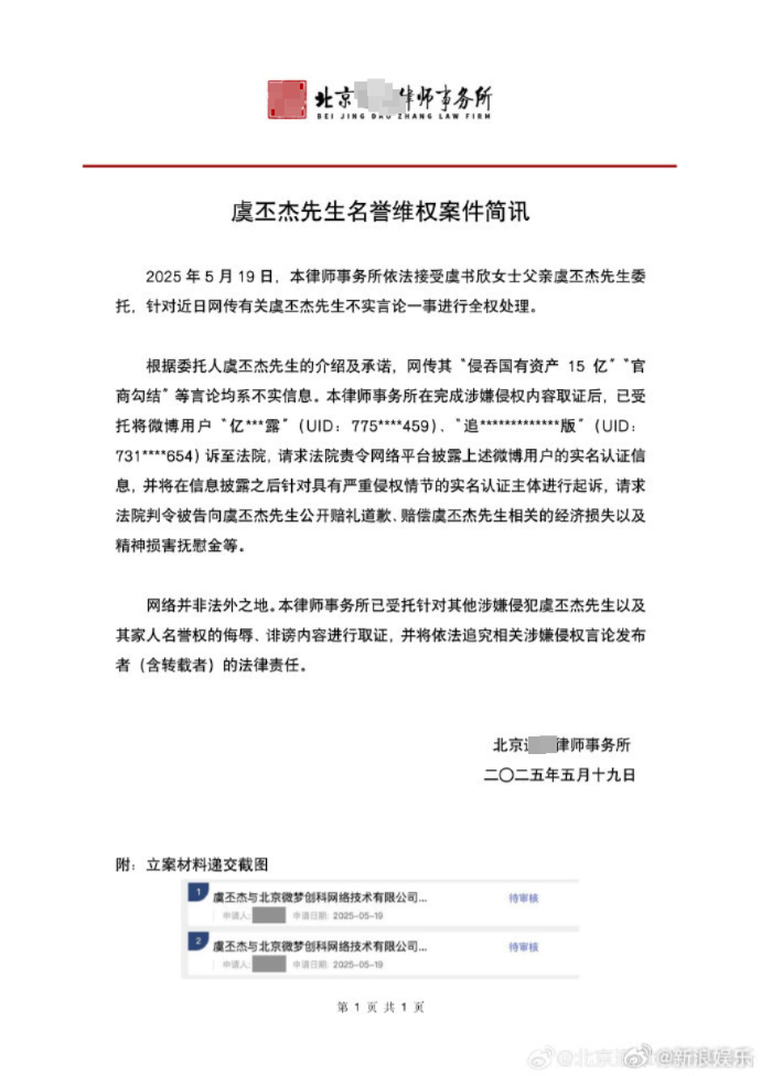 早在今年5月19日,某律师事务所发布案件简讯,称受虞书欣父亲虞丕杰委托,“针对近日网传有关虞丕杰先生不实言论一事进行全权处理。”该简讯中,提及两位网友发表不当言论。此前,网络上有虞书欣父亲虞丕杰关联企业与某国企之间合作的猜测,尤其以某财经账号发布的视频关注度最高,引发舆论热议,后该系列视频已下架。而两名被告网友在微博中发布的相关言论,则被虞丕杰诉至法庭。