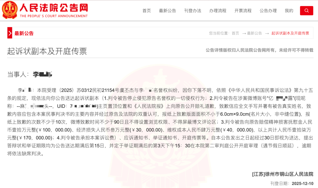 12月10日,在人民法院公告网显示的最新公告中,有一份起诉状副本及开庭传票涉及虞丕杰与李某某名誉权纠纷。公告称,因被告李某某下落不明,“现依法向你公告送达起诉状副本、应诉通知书、举证通知书、开庭传票等。”