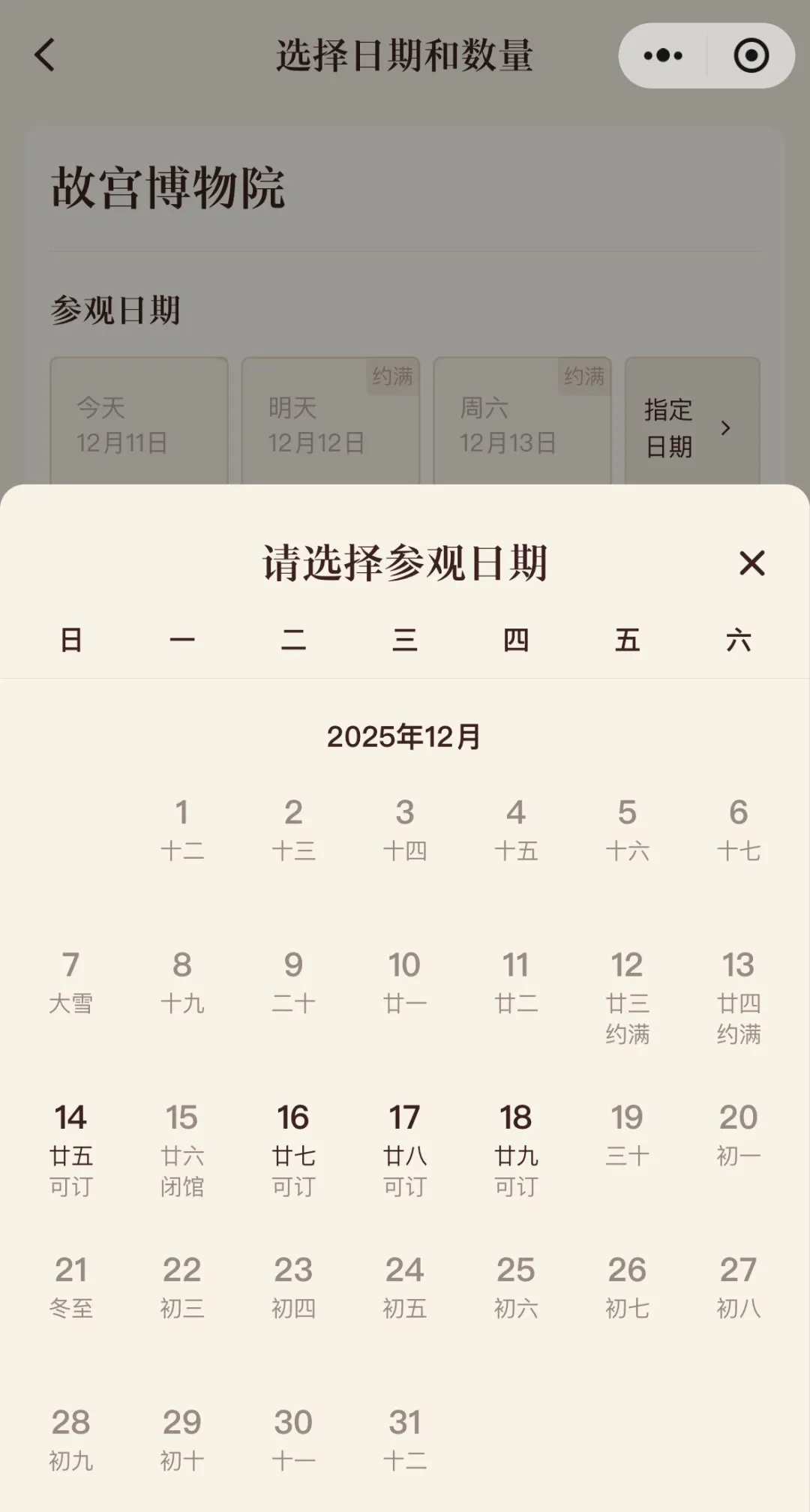 “故宫博物院”小程序显示,目前12月12日(周五)全天、13日(周六)全天以及14日(周日)上午的故宫门票皆已约满。