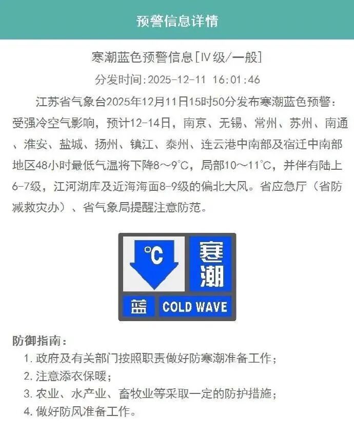江苏省气象台2025年12月11日15时50分发布寒潮蓝色预警
