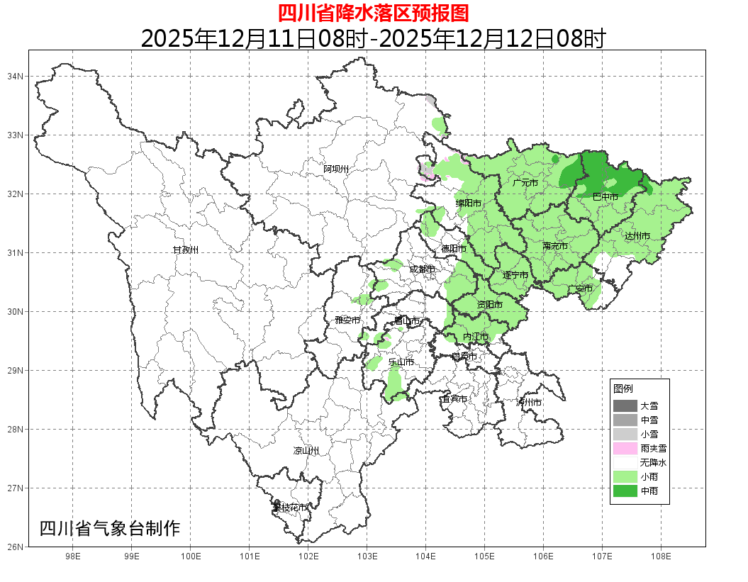 12日白天到晚上,盆地大部阴天有小雨,达州、广安2市东部有中雨,高海拔山区有雨夹雪或小雪,冷空气影响时,北部中部有5-7级偏北风;川西高原东部边缘和凉山州东北部阴天间多云有分散阵雪(雨),川西高原和攀西地区的其余地方晴间多云。