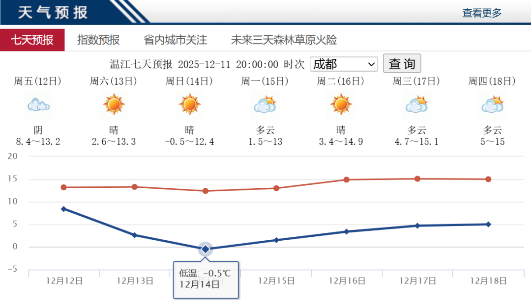 14日天气开始转好,但早间最低气温在0℃左右。请注意防范。