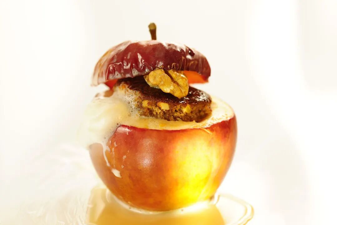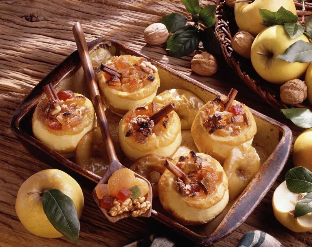 其中一种做法是将苹果芯掏空,塞进各类坚果碎,烤至苹果表皮发皱、颜色金黄,据说口感非常清新。
