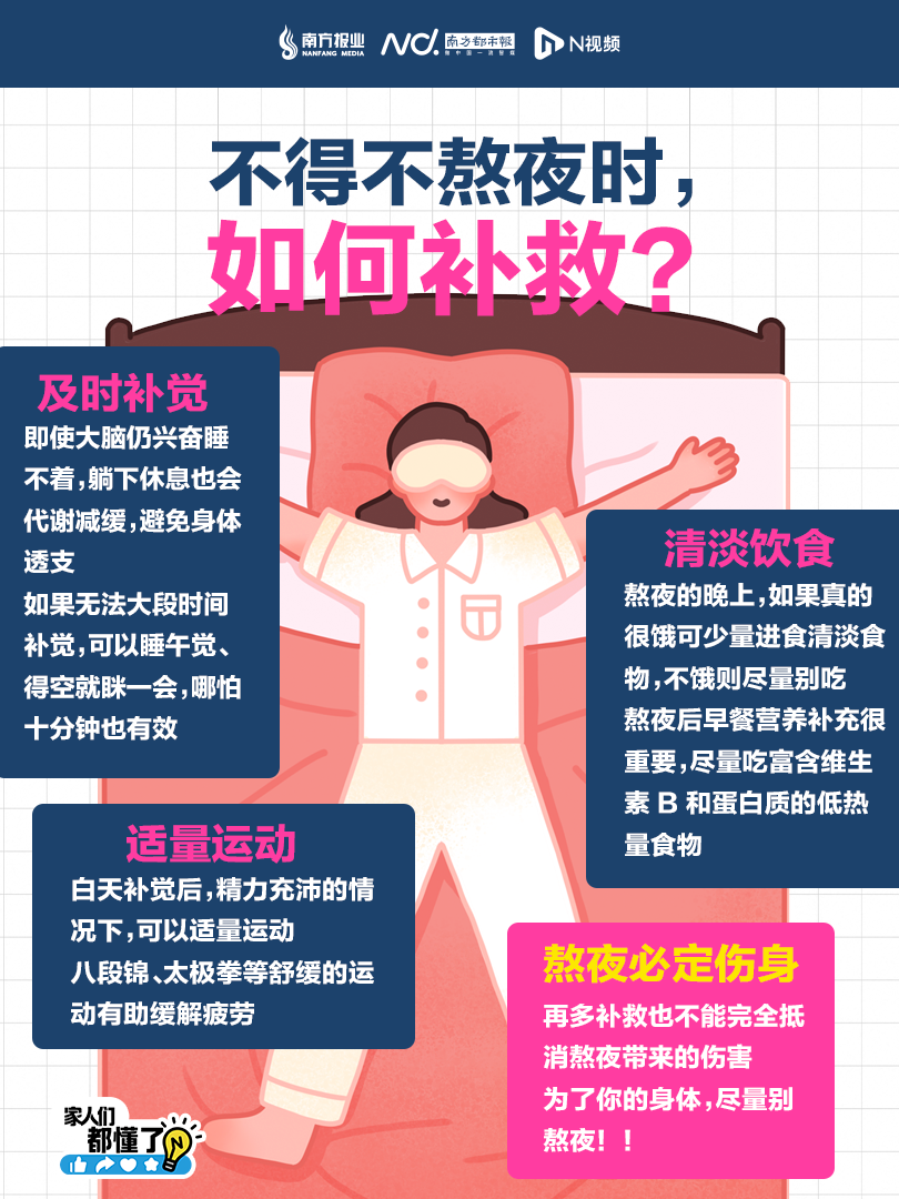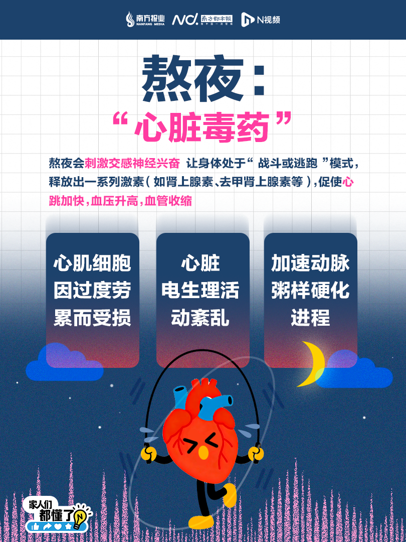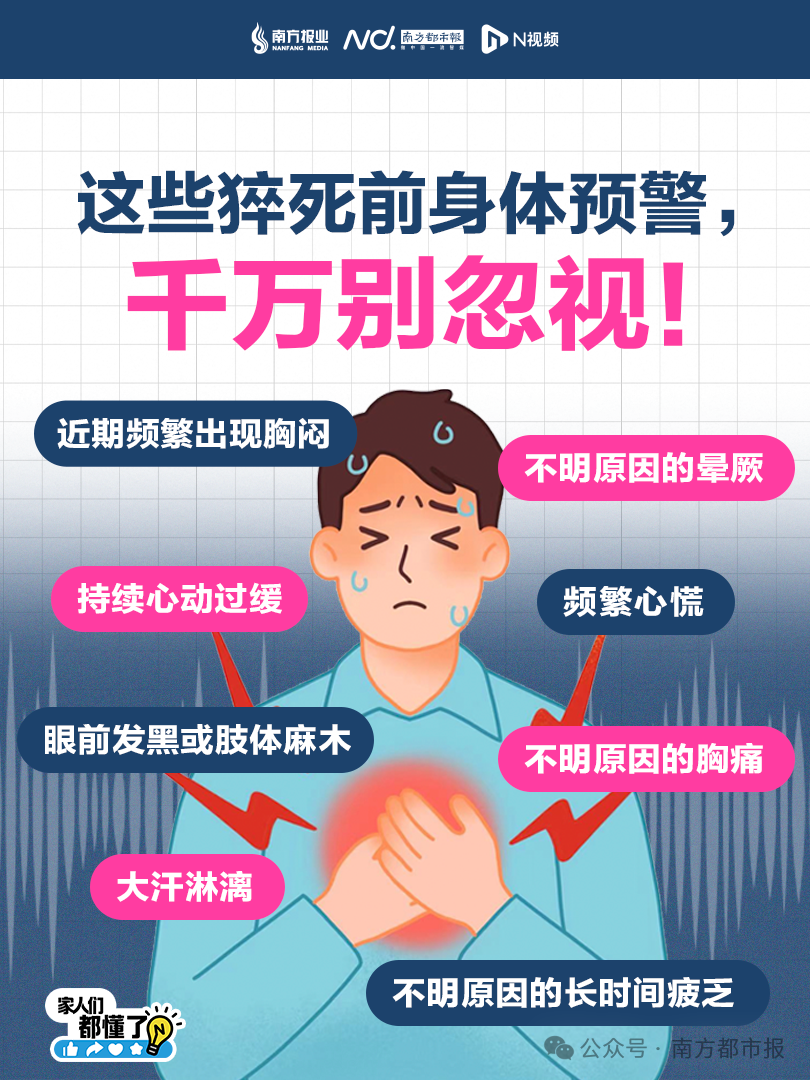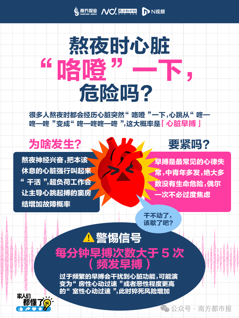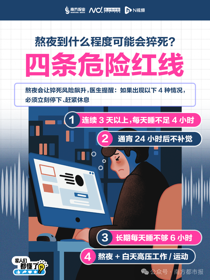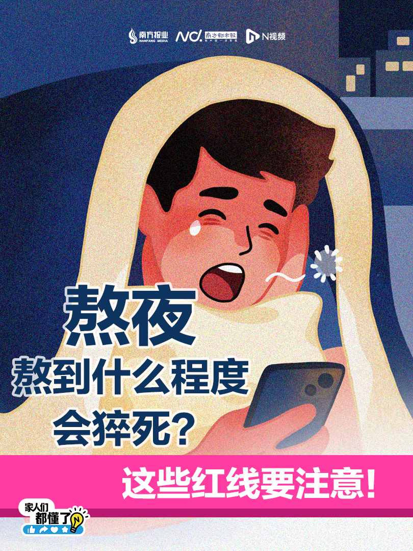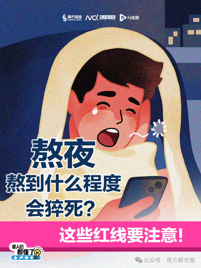 ⬅️左滑图片查看⬅️你有没有经历过熬夜熬着熬着,感觉胸口不太舒服?小心!熬夜熬多了,真有可能猝死……据媒体报道,今年10月,一名43岁短剧导演突然猝死,家人发现他已连续熬夜4天,推测单日工作时长超17小时。◽️ 熬夜,伤心脏熬夜会刺激交感神经兴奋,让身体处于“战斗或逃跑”模式,释放出一系列激素(如肾上腺素、去甲肾上腺素等),促使心跳加快,血压升高,血管收缩;长期熬夜导致心肌细胞因过度劳累而受损,心脏电生理活动紊乱,加速动脉粥样硬化进程。❗️ 熬到什么程度可能猝死?医生提醒:如果出现以下4种情况,必须立刻停下、赶紧休息连续3天以上,每天睡不足4小时通宵24小时后不补觉长期每天睡不够6小时熬夜+白天高压工作/运动❓ 熬夜时心脏“咯噔”一下,危险吗?熬夜神经兴奋,把本该休息的心脏强行叫起来“干活”,超负荷工作会让主导心跳起搏的窦房结增加故障概率,心跳从“咚—咚—咚”变成“咚—咚咚—咚”,被称为「心脏早搏」早搏是最常见的心律失常,中青年多发,绝大多数没有生命危险,偶尔一次不必过度焦虑⚠️警惕信号:每分钟早搏次数大于5次(频发早搏)过于频繁的早搏会干扰到心脏功能,可能演变为“房性心动过速”或者恶性程度更高的“室性心动过速”,此时猝死风险增加 这些猝死前身体预警,千万别忽视!一旦出现这些身体症状,请务必停止熬夜,及时去医院:· 近期频繁出现胸闷· 频繁心慌· 持续心动过缓· 不明原因的晕厥· 不明原因的长时间疲乏· 不明原因的胸痛· 眼前发黑或肢体麻木· 大汗淋漓 不得不熬夜时,如何补救?1️⃣及时补觉即使无法大段时间补觉,可以睡午觉、得空就眯一会,哪怕十分钟也有效2️⃣清淡饮食熬夜的晚上,不饿尽量别吃;熬夜后早餐营养补充很重要,尽量吃富含B族维生素和蛋白质的低热量食物3️⃣适量运动白天补觉后,精力充沛的情况下,可以适量运动‼️ 熬夜必定伤身再多补救也不能完全抵消熬夜带来的伤害为了你的身体,尽量别熬夜!南方都市报(nddaily)报道 “家人们都懂了”栏目总策划 | 戎明昌 刘江涛执行策划 | 王佳统筹 | 李湘莹执行统筹 | 张楚男 蔡宝春执行 | 杨晨欢设计 | 罗锐 实习生 黄小嘉资料来源 | 生命时报、央视新闻、人民网科普、国家应急广播、河南广播电视台等