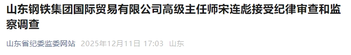 山东钢铁集团国际贸易有限公司高级主任师宋连彪涉嫌严重违纪违法,目前正接受山东钢铁集团有限公司纪委纪律审查;经山东省监委指定管辖,枣庄市峄城区监委对其监察调查。